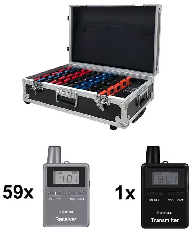 A szett 59 vevőt és 1 adót tartalmaz, valamint praktikus guruló töltőkofferrel érkezik, így egész napos használatra is alkalmas.