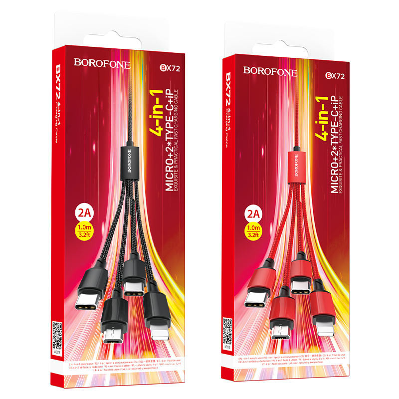 BOROFONE BX72 4 az 1-ben, töltőkábel Lightning / Micro-USB / USB-C*2, 1m, akár 2 A-ig terjedő áramerősséggel 1. Hossza: 1m (fő kábel 0,8m + alkábel 0,2m), súly: 43g 2. Külső anyag: nejlonszövés. 3. Csatlakozó anyag: alumíniumötvözet. 4. Mag: főkábel (34/0,1)*2+ alkábel (26/0,1)*2 OD3,2mm 5. Áram akár 2A-ig. 6. Az adatátvitel nem támogatott.