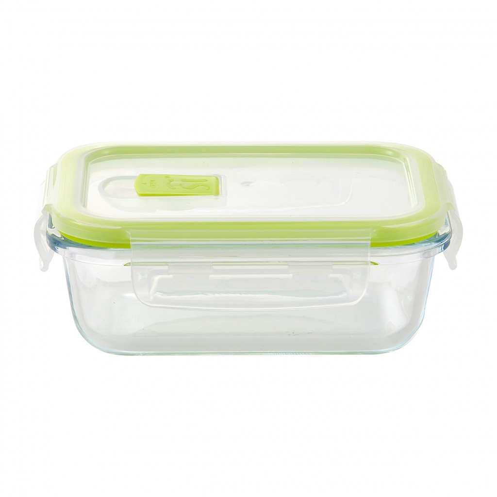 Boroszilikát tárolóedény, műanyag csatos fedővel. A boroszilikát az üvegnél sokkal törésállóbb és hőálló anyag, így használató mikrohullámú sütőben és fagyasztóban is -20 és 400 fok között. Űrtartalom 370ml.