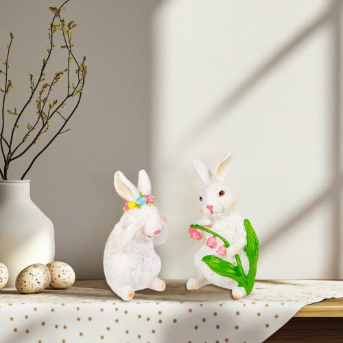 Varázsoljon tavaszi hangulatot otthonába ezzel a bájos húsvéti nyuszidekorációval! A kétféle változatban kapható nyuszik részletgazdag kidolgozásukkal és kedves megjelenésükkel remek kiegészítői lehetnek ünnepi asztaldíszeknek, polcoknak vagy ajándékcsomagoknak. Az egyik nyuszi virágokkal díszített koszorút visel, míg a másik egy szép virágszálat tart a kezében.
