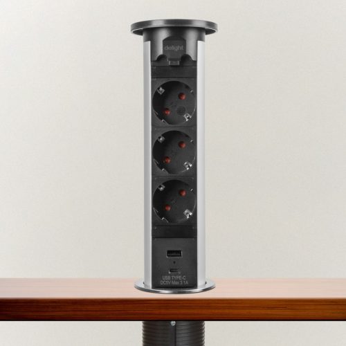 Motorosan süllyeszthető rejtett elosztó irodai és otthoni felhasználásra, fém házzal, 3 db gyermekvédelemmel ellátott hálózati aljzattal, dupla USB töltőegységgel. A legtöbb felületbe és design-ba beleillő kialakítás, függőleges beépítési lehetőség mérsékelten vízhatlan kezelőfelület.