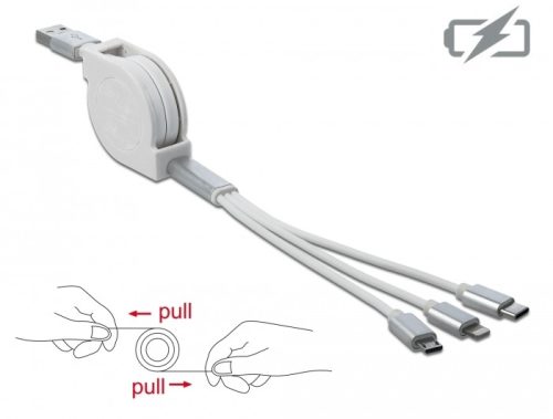 Delock 3 az 1-ben visszahúzható fehér USB töltokábel 8 tus- / Micro-USB- / USB Type-C  végzodéssel (DL-85850)
