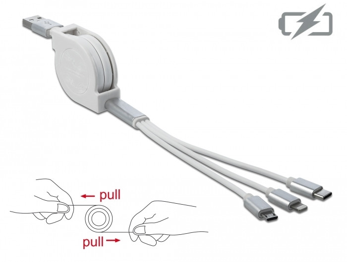 Ez a praktikus Delock 3 az 1-ben visszahúzható kábel kapcsolható egy tápforráshoz A-típusú USB-vel és használható különöböző eszközök töltésére a Lightning segítségével, vagy Micro-USB, illetve USB Type-C csatlakozó felületen keresztül. Három eszköz egyidejű töltése szintén lehetséges, amikor a teljes kimeneti áram 2 A szétosztódik mindegyik vezetéken.