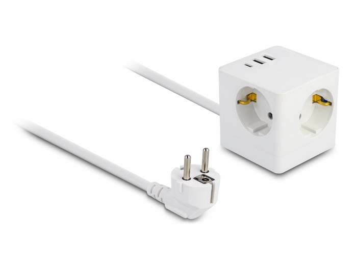 A Delock csatlakozó kocka hosszabbító USB töltő funkcióval alkalmas különböző eszközök kényelmes csatlakoztatására. A fali konnektorhoz tartozó csatlakozó beépített így az eszköz rögzíthető közvetlenül a falba vagy az asztal alá.