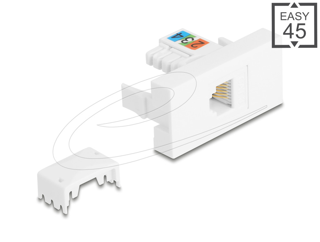 Ezt a Delock Easy 45 modult úgy tervezték, hogy telefonkábel portot biztosítson , és csatlakoztatható a Delock Easy 45 modulrendszerhez. Az egyszerű bepattintható mechanizmus biztosítja, hogy a modul szilárdan a helyén legyen, és szükség esetén könnyen eltávolítható.