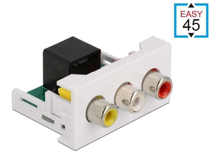 Ezt a Delock Easy 45 modult úgy tervezték, hogy három RCA anya csatlakozót biztosítson. Az egyszerű csatlakoztatási mechanizmus biztosítja, hogy a modul megfelelő helyzetbe kerül és könnyen ki is húzható, amennyiben szükséges. Az előre telepített hálózati kábel összeköthető vagy meghosszabbítható az RJ45 csatlakozóhoz.