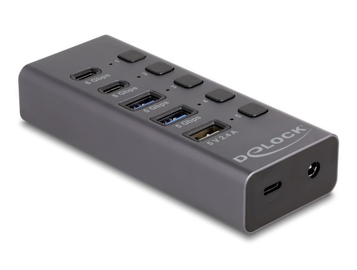 Delock Hub USB 5 Gbps 2 x A-típusú és 2 x USB Type-C anya és 1 x gyorstöltő port + kapcsoló (DL-64248)