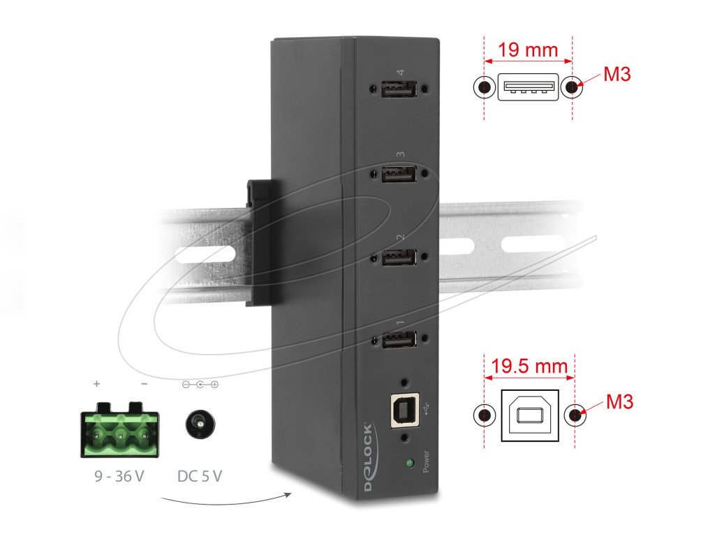 Ez a Delock tömör ipari felhasználhatóságú USB Hub összeköthet egy számítógépet A-típusú USB csatlakozási felülettel. Négy A-típusú USB-csatlakozóval bővíti ki a számítógépét.