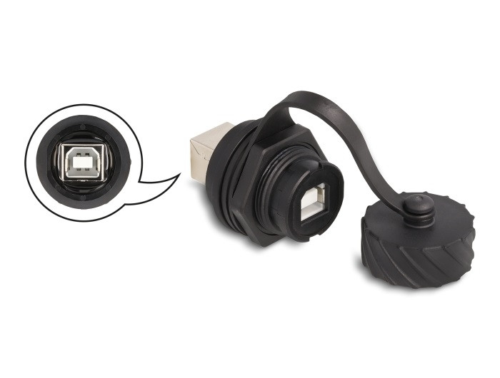 Delock USB 2.0 B-típusú kábel csatlakoztató anya anya installálásra IP68 por és víz elleni védő bajonettzá kalappal fekete (DL-88004)