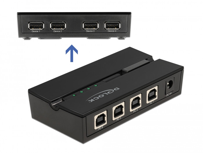 Ez a Delock USB kapcsoló lehetővé teszi, hogy négy USB 2.0 perifériás eszközt négy különböző számítógépes rendszerben osszunk meg. Így nem szükséges több perifériás eszközt vásárolni, és a kábelek egyik rendszerből a másikba való áthelyezéssel sem kell bajlódni.