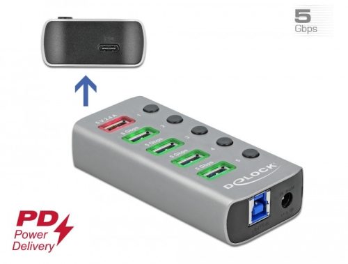 Delock USB 3.2 Gen 1 hub 4 porttal valamint 1 gyorstöltő porttal és 1 USB-C PD 3.0 porttal kapcsoló (DL-63263)