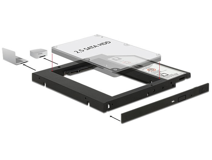 Ez a Delock vékony kialakítású szerelokeret a számítógép szabad 5.25 -es SATA vékony bovítohelyére szerelheto, így 2.5 -es SATA HDD illesztheto bele.