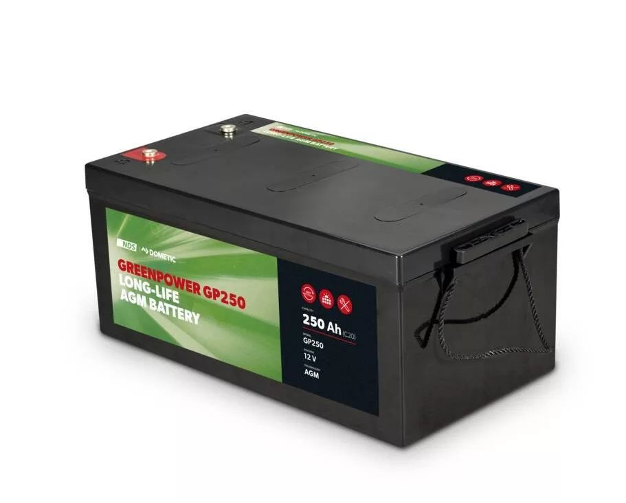 A Dometic NDS GreenPower AGM GP250 lakóautó akkumulátor speciálisan lakóautókhoz tervezett, karbantartásmentes mélyciklusú akkumulátor. Az AGM technológia és az ólom-kálcium ötvözetű lemezek révén hosszú élettartamot és stabil működést biztosít akár 1200 cikluson keresztül.