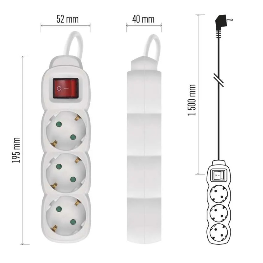 Emos P1321R Hosszabbító 1,5 m / 3 aljzat / kapcsolós / fehér / PVC / 1,5 mm²