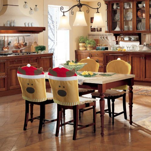 Domború, filcből készült, rénszarvas mintával ellátott székdekoráció az ünnepekre.