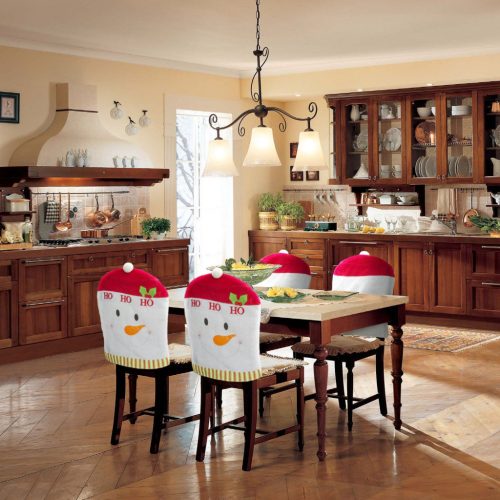 Mikulássapka formájú, domború hóember mintával ellátott székdekoráció az ünnepekre.