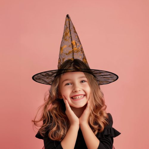 Hegyes, 4 színben kapható boszorkánykalap, amely kiváló halloween-i jelmez kiegészítő. A kalap külső részén aranyszínű, csillogós halloween-i motívumok találhatóak.