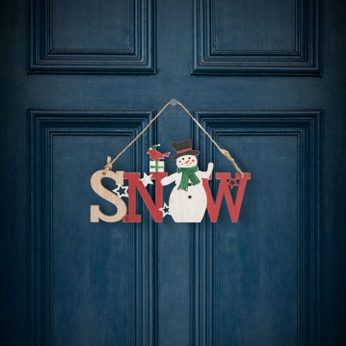 Karácsonyi dekoráció fából, "SNOW" felirattal és aranyos hóember mintával. Madzag akasztójának köszönhetően akár ajtódíszként is funkcionálhat, de lakása bármely helységében elhelyezheti.