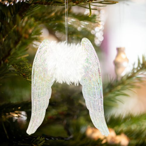 Ez a karácsonyi dísz egy különleges irizáló hatású angyalszárny pár, amelyek elegánsan díszítik a karácsonyifát vagy bármely más ünnepi összeállítást. Az akrilból készült dísz könnyű, mégis strapabíró, így évről-évre újra felhasználható. Az irizáló hatás miatt a dísz színei változnak az árnyékoktól és a fénytől függően, ami még varázslatosabbá teszi a karácsonyi díszt. Az elegáns megjelenésének köszönhetően ez a karácsonyi dísz kiváló ajándék lehet szeretteinknek vagy barátainknak is.