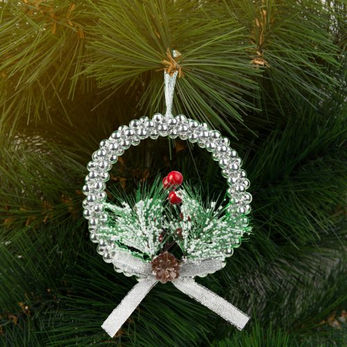 Karácsonyi dekoráció - akasztható - ezüst koszorú - 10 cm