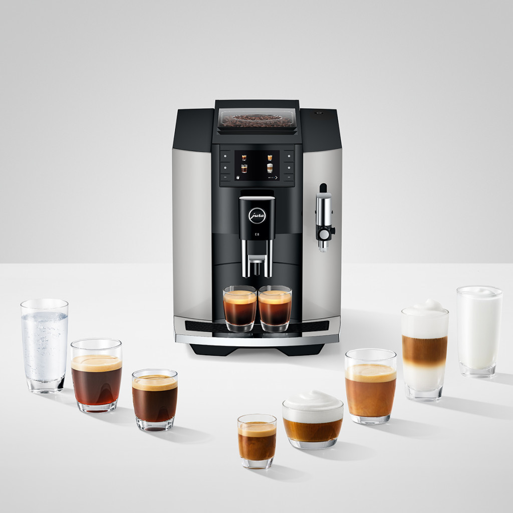 Az E8 klasszikus kávéklasszikusok és kávékülönlegességek széles választékát kínálja, amelyeket tökéletesen elkészít. Tizenhét lehetőség közül választhat, amelyek mindegyike egy gombnyomással kiválasztható. Egy szimpla kávétól egy tejhabbal borított különlegességig. Ezek mindegyike testre szabható az egyéni ízlésnek és a kívánt csészeméretnek megfelelően. A legmodernebb technológia optimális körülmények között minden keverékből és pörkölésből maximális aromát von ki, a legfinomabb eredmény érdekében.