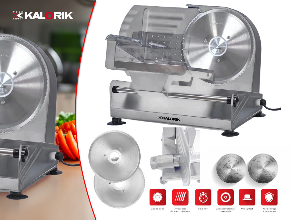 Vágási vastagság 0-15mm Teljesítmény 220 W 2db kivehető, cserélhető rozsdamentes acél vágópenge Penge átmérője 19 cm Adagolólap rozsdamentes acél Átlátszó élelmiszer tálca Csúszásmentes talp Vezeték hossz 80 cm Tökéletes kenyér, hús, saj, szalámi, kolbácz és egyéb élelmiszerek szeletelésére Támasztóasztal, kézvédő és biztonsági kapcsoló Biztonsági zár a kés cseréjéhez vagy tisztításához 1db hullámcsiszolt keményebb, akár fagyasztott ételekhez ( sültek, gyümölcsök ) 1db sima penge vékonyabb és könnyebb szeleteléshez ( sajt, zöldség stb ) Logozott fém érme, a pengék cseréjéhez Exkluzív metál külső géptest