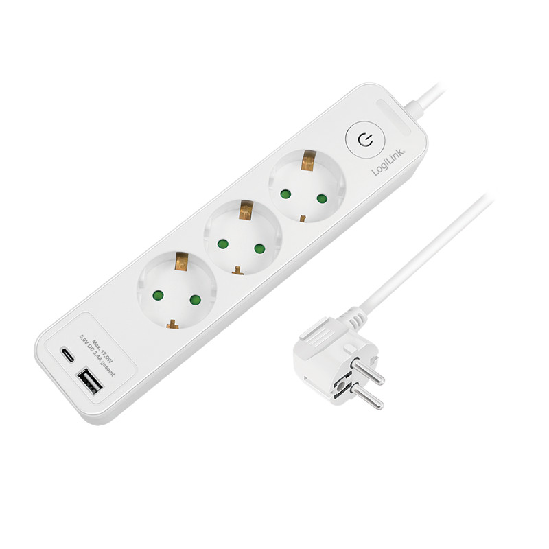 Logilink Aljzat 3 utas + kapcsoló, 3x CEE 7/3, 1x USB-A, 1x USB-C, 1,5 m, fehér (LPS279U)