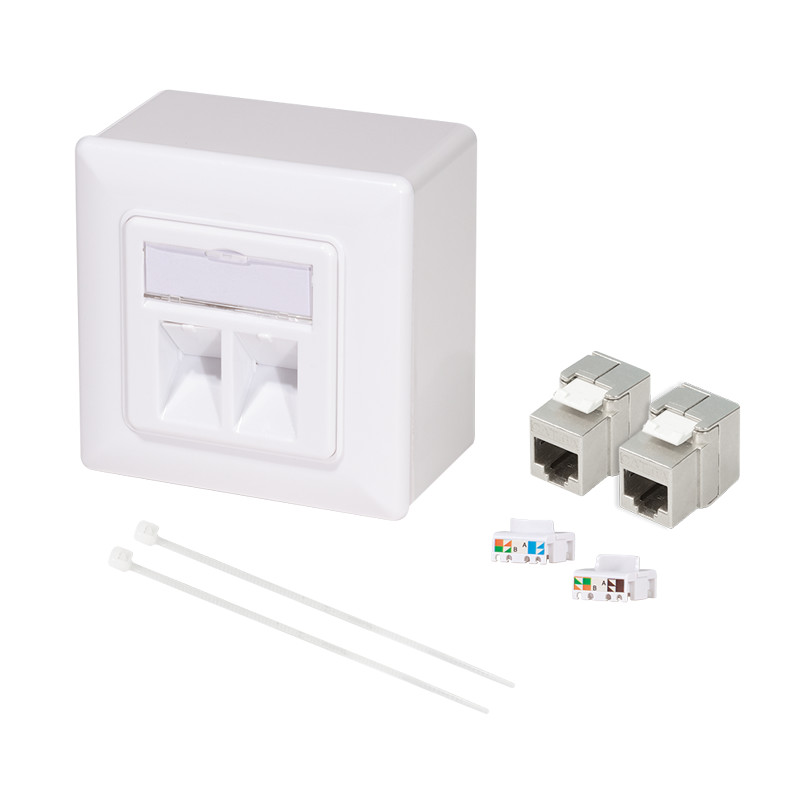 Kimenet két árnyékolt Cat.6A modullal Felületre, falra és kábelcsatornára szerelhető Alkalmas Cat.6A/Cat.7/Cat.7A 5-8,5 mm átmérőjű kábelekhez 22 26 AWG tömör és sodrott kábelt fogad 45 -os dőlésszögű nyílás, porvédők, feliratozási mező Keret méretei 80 x 80 mm, betét 50 x 50 mm Szín: fehér, hasonló a RAL 9003-hoz Felületre szerelhető doboz mellékelve Általános termékadatok: Súly: 0,13 kg Magasság: 5 cm Szélesség: 8 cm Hossza: 8 cm