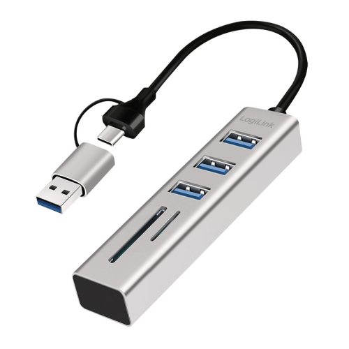 Logilink USB 3.0 hub, 3x USB-A, SD/microSD nyílás, 2 az 1-ben csatlakozókábel, 5 Gbit/s, ezüst (UA0445)