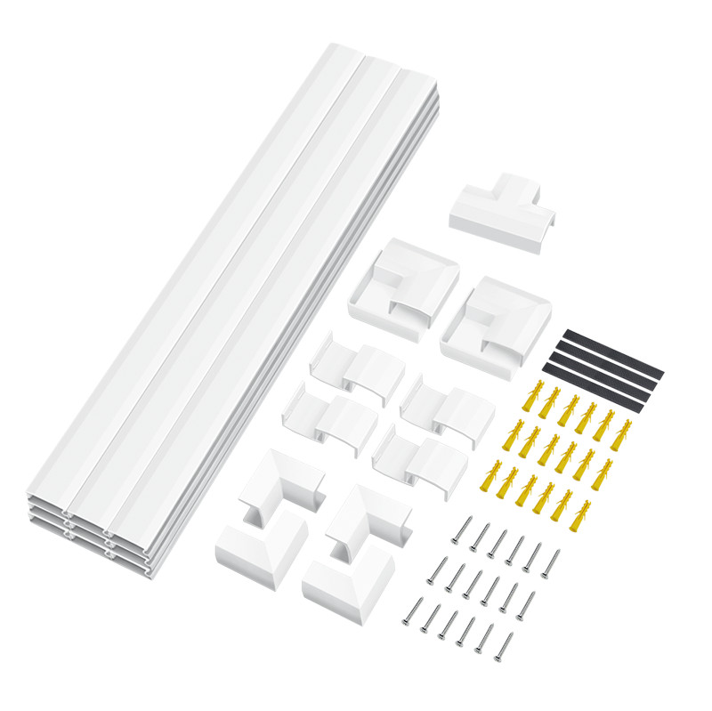 Kábelcsatorna készlet falra szereléshez Megszünteti a kábelrendetlenséget egy(n) rendezett irodában és otthonban Egyszerű rögzítés kétoldalas ragasztószalaggal és/vagy csavarokkal és dübelekkel Sokoldalú rögzítési lehetőségek a különféle szögcsatlakozóknak köszönhetően A fal színéhez illően festhető Kábelcsatorna méretei: 30 x 15 x 432 mm A készlet tartalma: 9x kábelcsatorna, 8x csatlakozó, 4x lapos könyök, 2x belső könyök, 2x külső könyök, 1x T-idom, 4x kábelkötegelő, 1x mérőszalag, 18x csavar, 18x tiplik Anyaga: Műanyag Fehér szín Csomag: színes doboz Általános termékadatok: Súly: 0,92 kg
