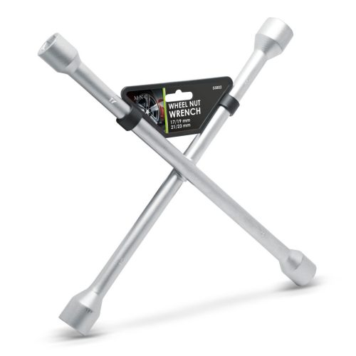 Kerékkulcs a legnépszerűbb kerékcsavar méretekhez. Aluminium ötvözetnek köszönhetően tartós, az erőkar meghosszabbításával könnyebb a csavar meglazítása.