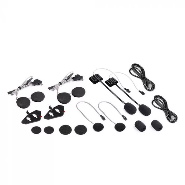 • A csomag tartalma: 2 db kommunikációs eszköz, 2 sztereó hangszórós és boom mikrofonnal ellátott audió szett, rögzítők a sisakhoz és 2 USB-C töltőkábellel