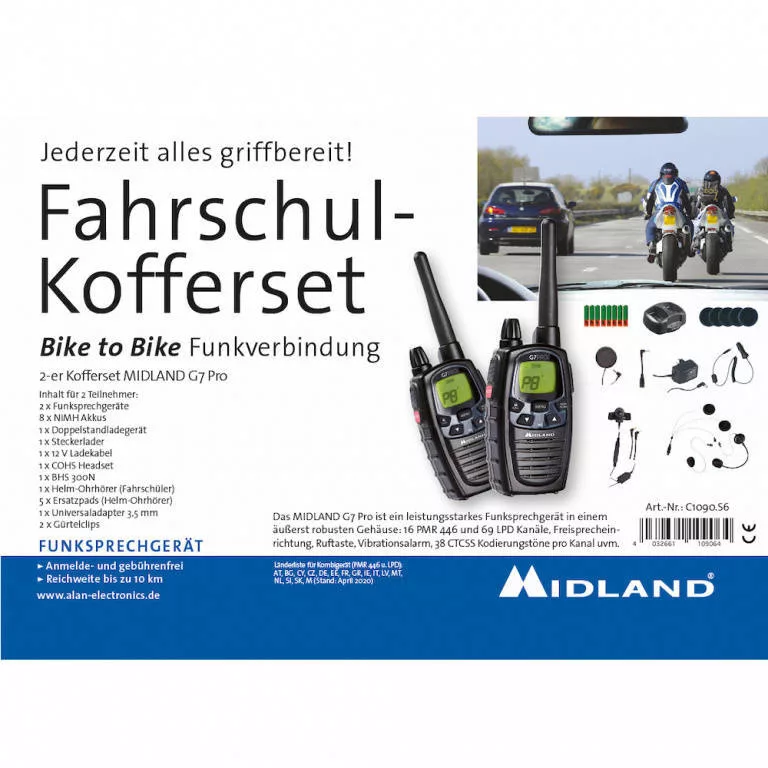 A Midland G7 Pro PMR adóvevő rádió 2db-os motoros oktató szett ideális választás motoros oktatáshoz és kommunikációhoz két motor között. A készlet minden szükséges eszközt tartalmaz a kényelmes és megbízható rádiózáshoz, beleértve a töltőt és sisak hallgatót is.