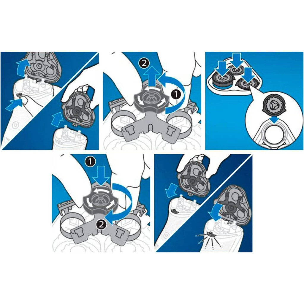 3. Távolítsa el a rögzítőgyűrűket. Vegye ki a régi borotvafejeket, és óvatosan helyezze be az újakat, ügyelve arra, hogy a borotvafejek egy vonalban legyenek.