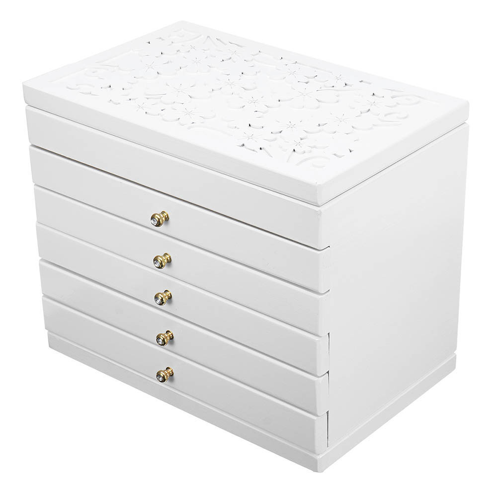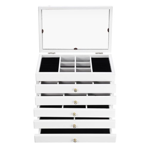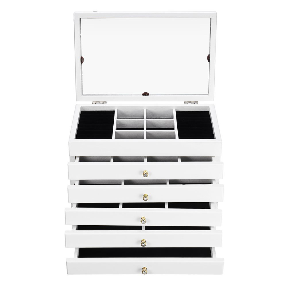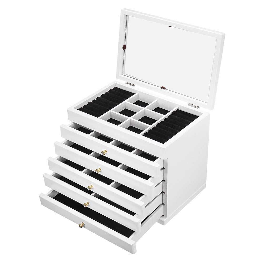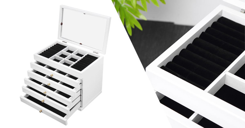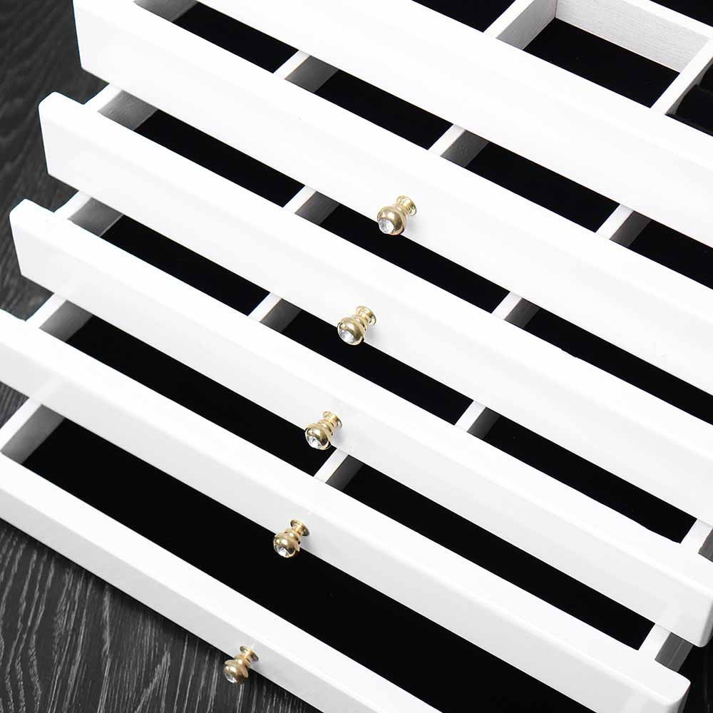 Ez a 6 rekeszes ékszertartó ideális választás mindazok számára, akik rendszerezetten szeretnék tárolni kedvenc ékszereiket. Az öt kihúzható fiók és a különálló tárolórekeszek biztosítják, hogy minden kiegészítőnek meglegyen a saját helye. A gyűrűk számára kialakított speciális hengerek megakadályozzák a karcolódást, így a drágább ékszerek is biztonságban maradnak.