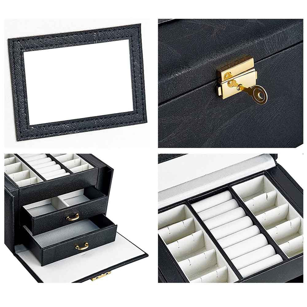 A táska két kihúzható fiókkal, gyűrűtartó hengerekkel és több apró rekesszel rendelkezik, így minden ékszerednek meglesz a maga helye. A tetején található arany színű zárhoz tartozó kulccsal biztonságban tudhatod értékes kiegészítőidet. A kompakt kialakítás ellenére bőséges tárolóhelyet kínál.