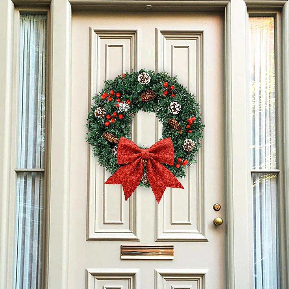 Hozd el az ünnepi varázst már az ajtóban! Ez a 60 cm-es karácsonyi ajtódísz elegáns megjelenésével és természetes hatású műfenyő ágaival azonnal megalapozza a karácsonyi hangulatot. Akár a bejárati ajtón, akár beltéren helyezed el, meghitt és ünnepi atmoszférát teremt. A dúsan elrendezett fenyőágak, a ragyogó piros szaténmasni és az időtálló dizájn biztosítja, hogy az ajtódísz minden otthon méltó éke legyen az ünnepi időszakban.