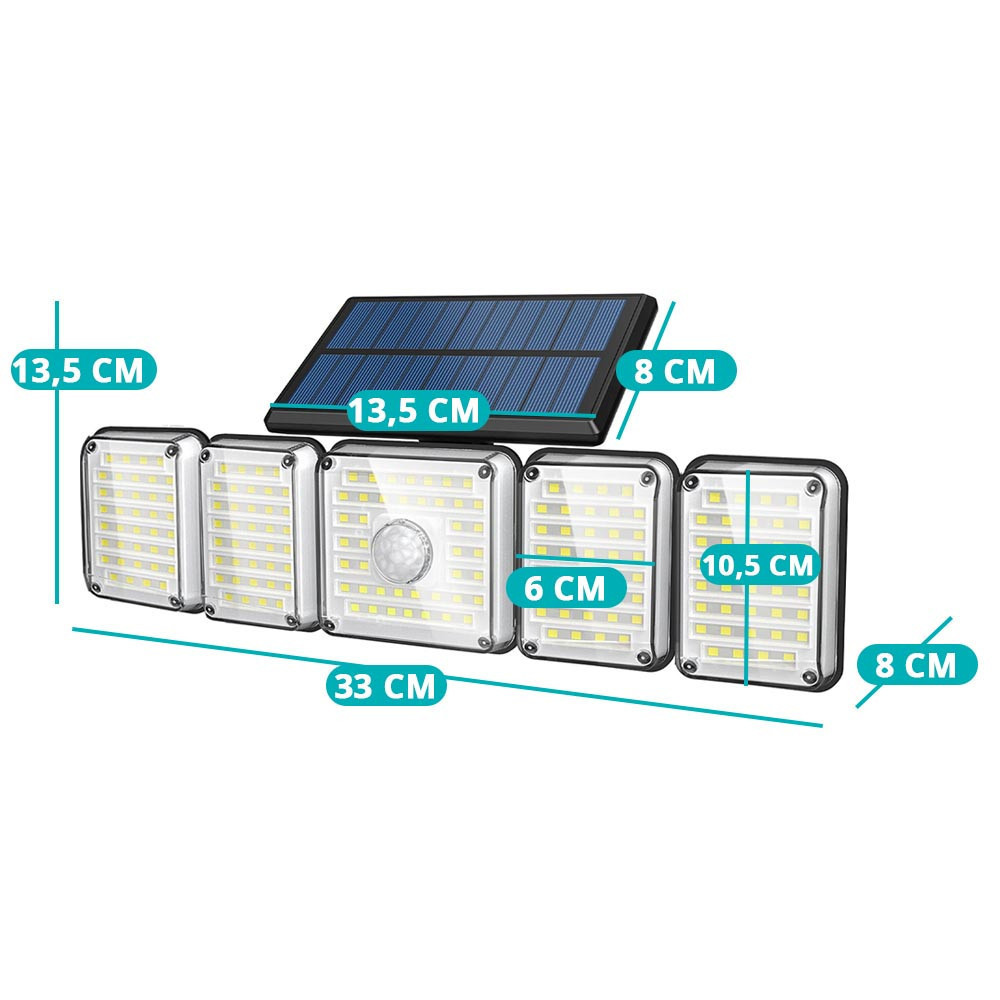 Az 5 paneles, forgatható, 300 LED-es szolár lámpa ideális nagyobb területek megvilágítására költséghatékony és környezetbarát módon. Napelemes működésének, mozgásérzékelő funkciójának és három világítási módjának köszönhetően udvarok, kocsibeállók és üzletek előtt is praktikus megoldást nyújt. A távirányítóval könnyen vezérelhető, időjárásálló kialakítása (IP65) pedig hosszú távú megbízhatóságot biztosít. Egyszerűen telepíthető, és a mellékelt tartozékokkal azonnal használatra kész.