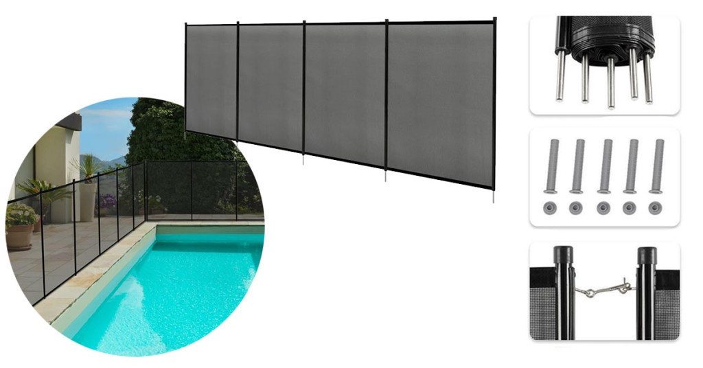 Több kerítés is egymáshoz kapcsolható, így a medence méretétől függetlenül, több csomag vásárlása esetén összekapcsolhatod őket.