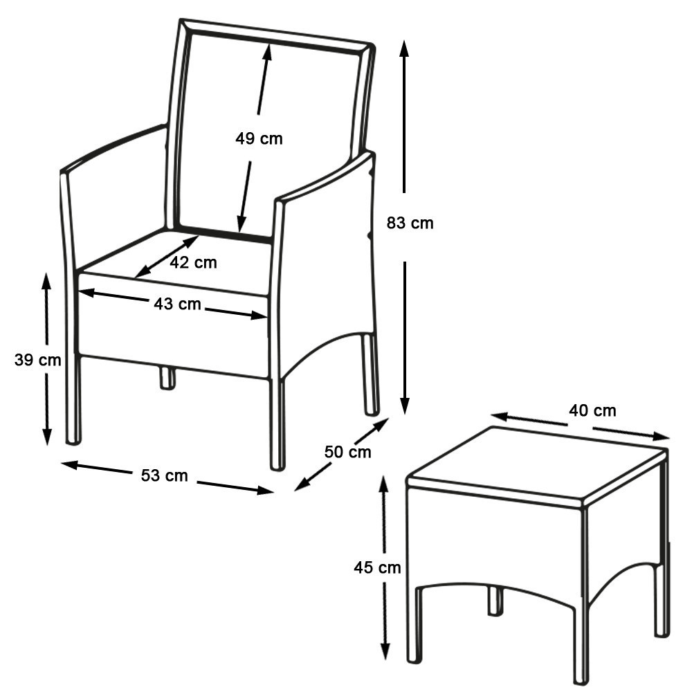 A szett kompakt méretei révén tökéletes választás kisebb teraszokra és erkélyekre. A székek 53x83x50 cm-es méretükkel kényelmesek és helytakarékosak, míg az asztal 40x40x45 cm-es mérete elegendő helyet biztosít, anélkül, hogy túlzsúfolná a teret.