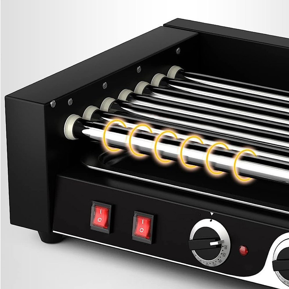 A görgős sütő ideális nagyobb társaságok számára is. A folyamatos forgatásnak köszönhetően minden virsli egyenletesen sül és melegen is marad.