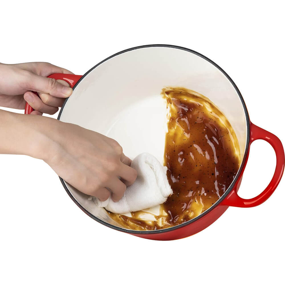 A zománc védelmet nyújt a rozsdásodás ellen, az öntöttvas szerkezet pedig hosszú távon megőrzi formáját és teljesítményét. Fontos: indukciós főzőlapon nem használható.