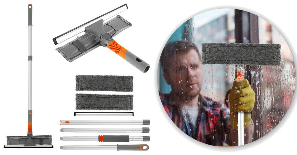 Az akár 163 cm hosszúságú teleszkópos nyéllel könnyedén elérheted a magasabb ablakokat, csempéket vagy más sima felületeket. Az előre és hátra hajlítható, 180 fokban dönthető fej tovább növeli a szett sokoldalúságát és kényelmes használatát.