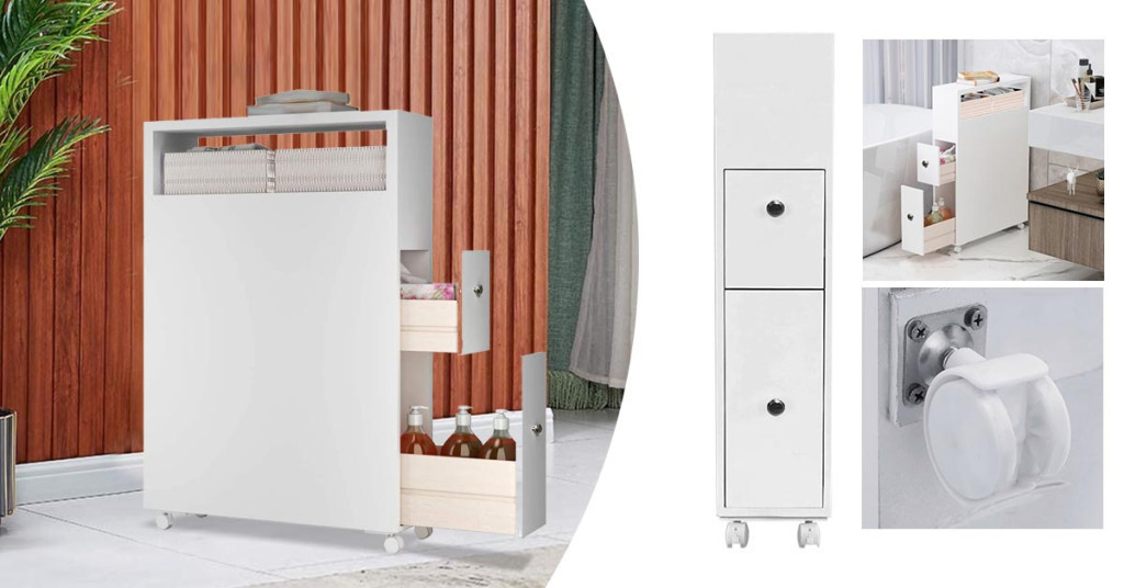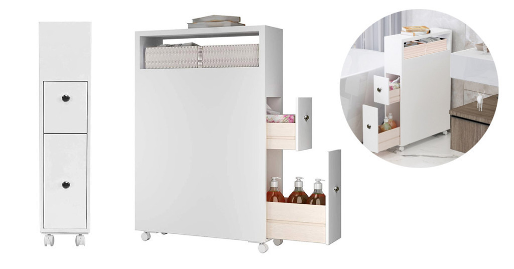 A szekrény keskeny és helytakarékos kialakítású, mindössze 15,5 cm széles, így szűk helyekre is beilleszthető, ahol más bútorok nem férnének el. Két tágas fiókjában könnyedén elrejtheted a holmijaidat, míg a tetején és a polcán további tárolási lehetőségeket kínál.