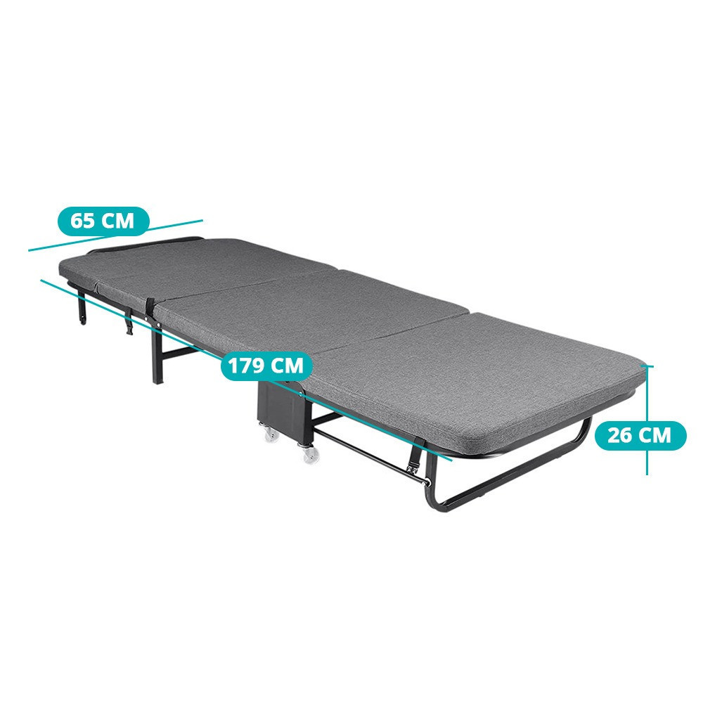Ez a praktikus és kényelmes vendégágy ideális megoldás, ha időszakosan plusz fekhelyre van szükséged. Kompakt kialakításának köszönhetően könnyen mozgatható és kis helyen is tárolható. Az 5 pozícióban állítható fejtámla maximális kényelmet biztosít, míg a 6 cm vastag matrac megfelelő tartást nyújt a pihentető alváshoz. Fixálható kerekeinek köszönhetően az ágy stabilan rögzíthető, így biztonságos használatot garantál.