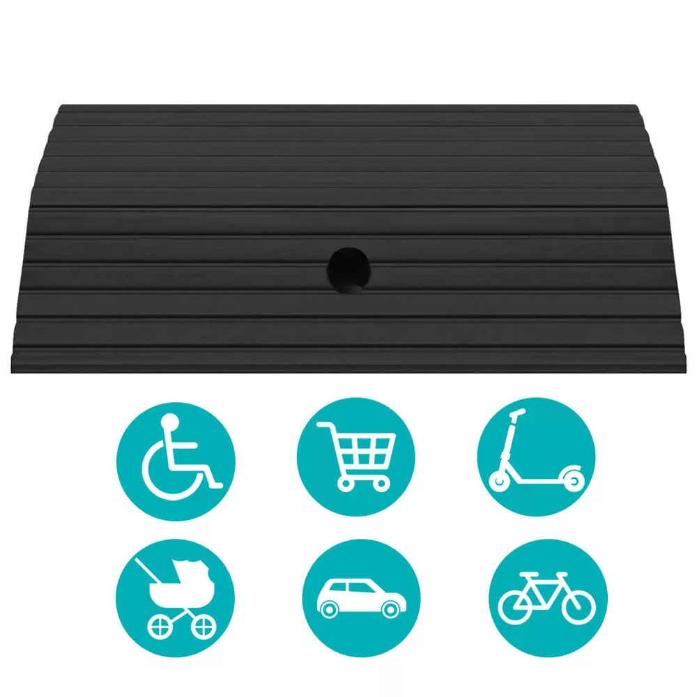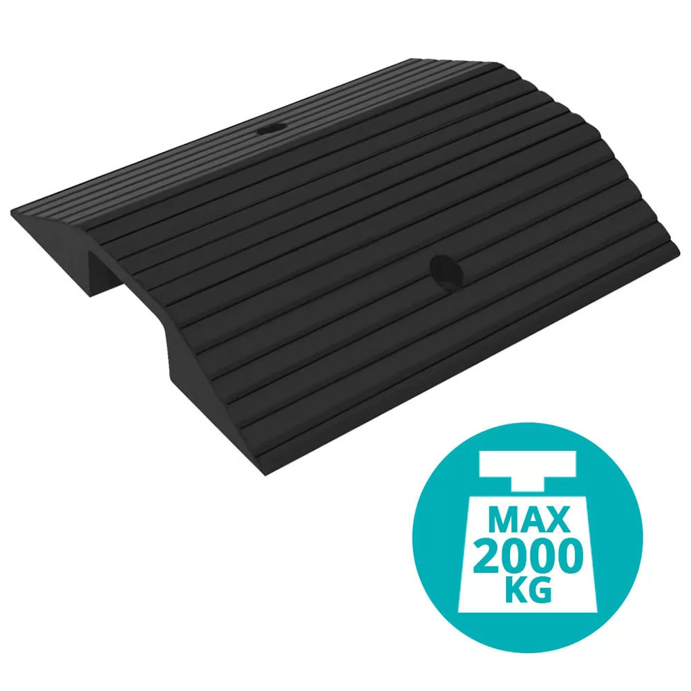 A küszöbrámpa masszív, tömör gumiból készült, amely képes elviselni akár 2 tonna terhelést is. Ideális megoldás járművek, nehezebb tárgyak és akadálymentes környezet kialakításához. Csúszásmentes kialakítása segít a biztonságos áthaladásban, miközben stabilan rögzíthető a csomagban található csavarok segítségével.