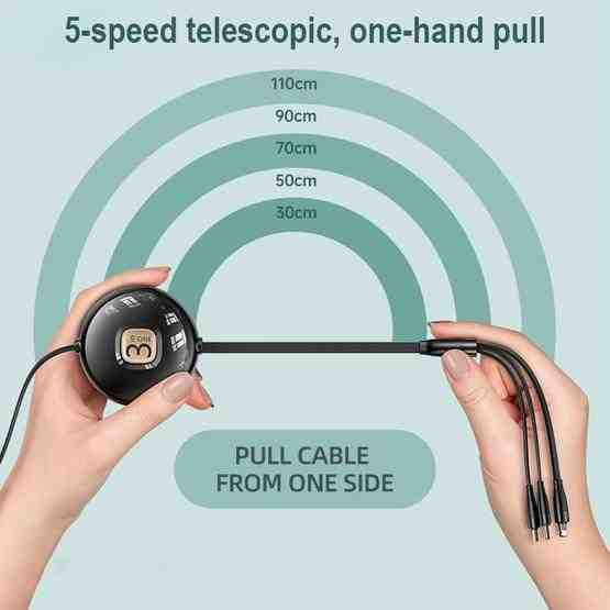 USAMS 3 az 1 ben töltőkábel, egyszerre 3 készülék egyidejű töltését teszi lehetővé. Micro usb, Typ-c és lightning töltőfejekkel ellátva. A kábel hossza 30cm és 110cm között változtatható. Praktikus tárolás az öncsévélő kábel dobban.