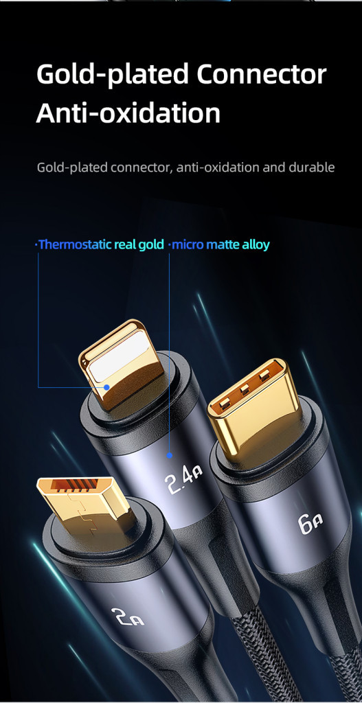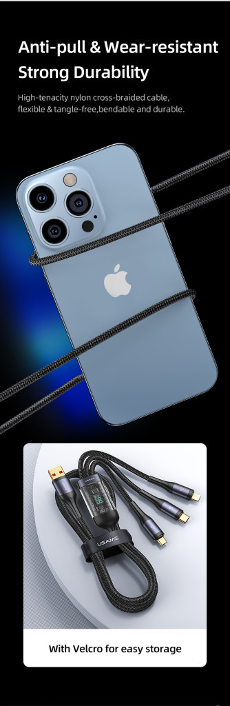 120 cm hosszú textil borítású kábel usb-c, micro usb és lightning csatlakozóval. USB-C max 66Watt teljesítmény és adatkábelként is használható Lightning 2.4A max. teljesítmény Micro usb 2A max. teljesítmény Aranyozott csatlakozók a gyorsabb töltésért. LCD kijelzőn mutatja a pillanatnyi töltési teljesítményt. Szövet borítású kábel a hosszabb élettartamért.