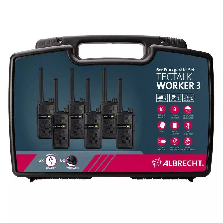 Az Albrecht TecTalk Worker 3 professzionális PMR adóvevő rádió 3 pár ideális megoldás hatékony kommunikációhoz akár szabadtéren vagy zárt helyeken. A készülék 16 csatornával és széles, 41 CTCSS + 211 DCS hívókód kombinációval biztosítja a zavarmentes beszélgetést, miközben akár 10 km-es hatótávolságot kínál.