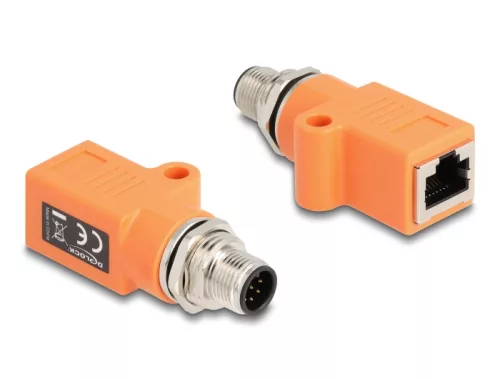 Delock M12 A-kódolt adapter 8 tűs apa - RJ45 anya Cat.5e beszerelő mélyedéssel egyenes, narancssárga színű (DL-60617)